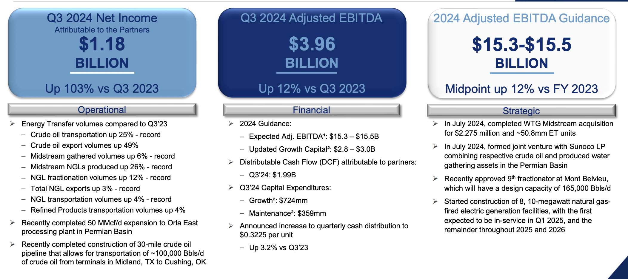 - Energy Transfer’s Q3 2024 results show record volumes and a 12% YoY increase in adjusted EBITDA, highlighting successful growth investments and strong DCF.