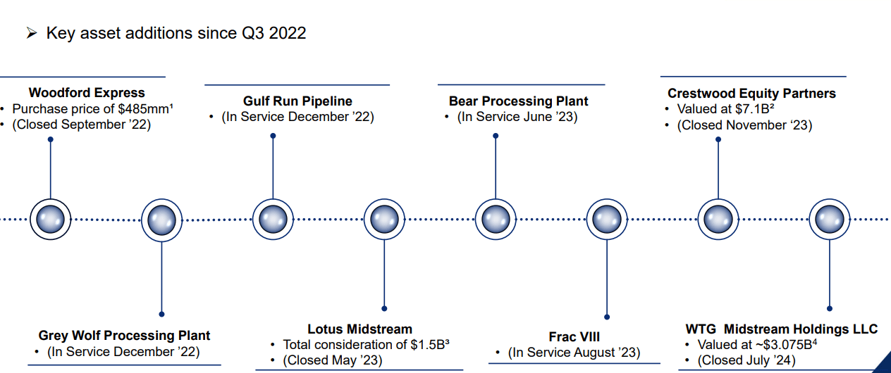 The company has continued to undergo massive acquisitions along with putting major assets into service. In 2023, the company spent almost $10 billion on acquisitions. The company recently closed its acquisition of WTG Midstream Holdings at roughly $3 billion. The acquisitions have strong incremental benefits for the company.
