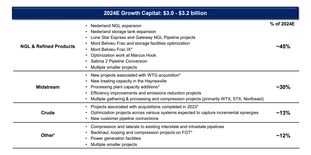 The company expects 2024E growth capital to be roughly $3 billion. The vast majority of that is going to go into NGL & refined products, with a smaller amount going into Crude. NGL has much more long-term potential than other industries, as natural gas demand is expected to remain higher for longer versus crude oil.