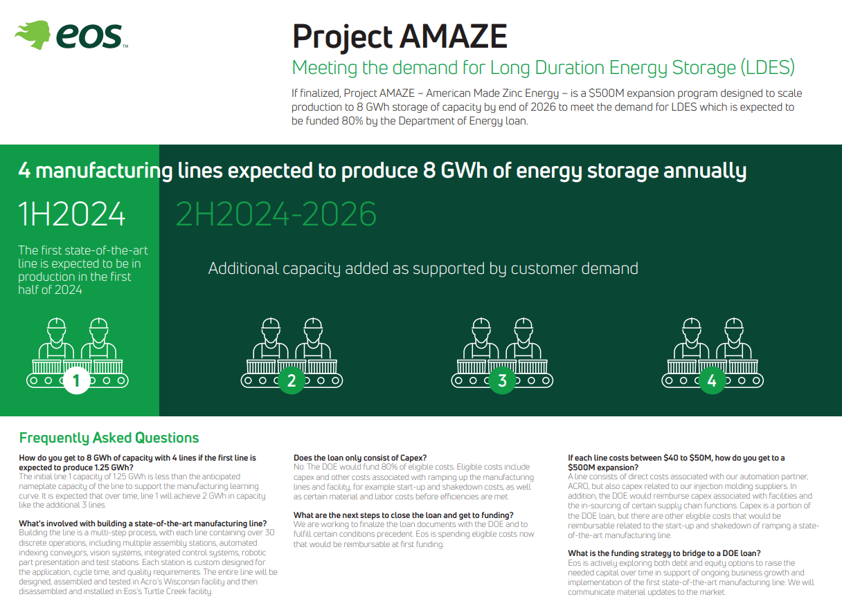 The investment by Cerberus is structured as a $210.5 million delayed draw term loan that is partially based upon achieving operational milestones, and a $105 million revolver that the Company may draw upon, if required, at Cerberus’ discretion. In addition, Eos will utilize a portion of the proceeds to retire its existing $100 million senior secured term loan on favorable terms, strengthening the Company’s balance sheet. The Company reached an agreement to extinguish this debt for $27 million, of which $20 million has been paid and the remaining $7 million will be payable over the next twelve months.