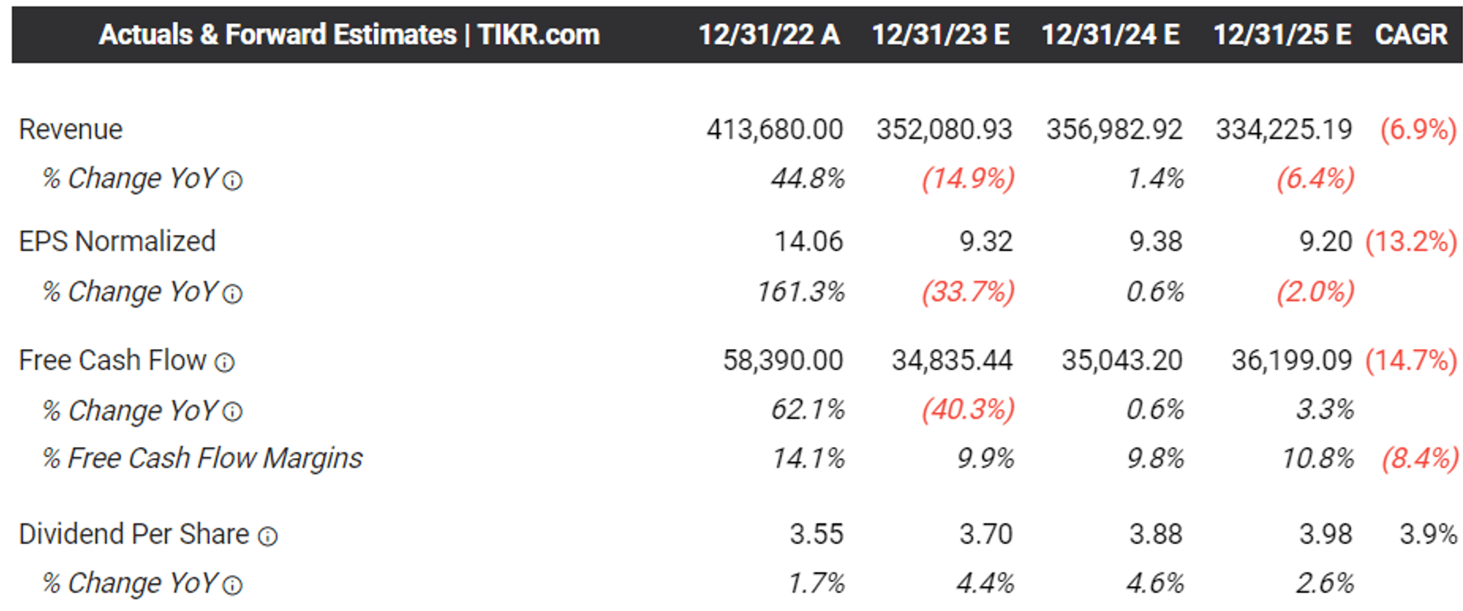 Perhaps this is attributed to the supposed normalization in XOM’s top and bottom lines at a CAGR of -6.9% and -13.2% through FY2025, compared to its historical CAGR of +10.6% and +34.6% between FY2016 and FY2022, respectively.