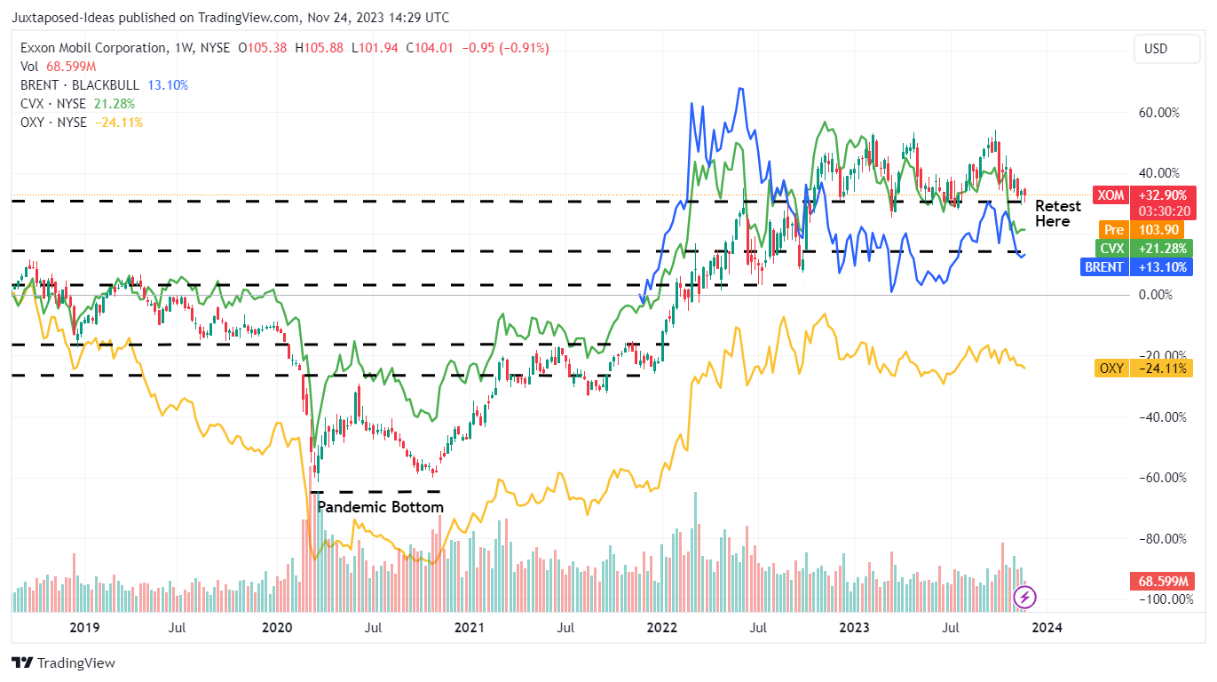 For now, it is unsurprising that XOM has returned much of its 2022 and 2023 gains, with the stock appearing to retest its critical support levels of $100s as Brent fails to stay above $90s.