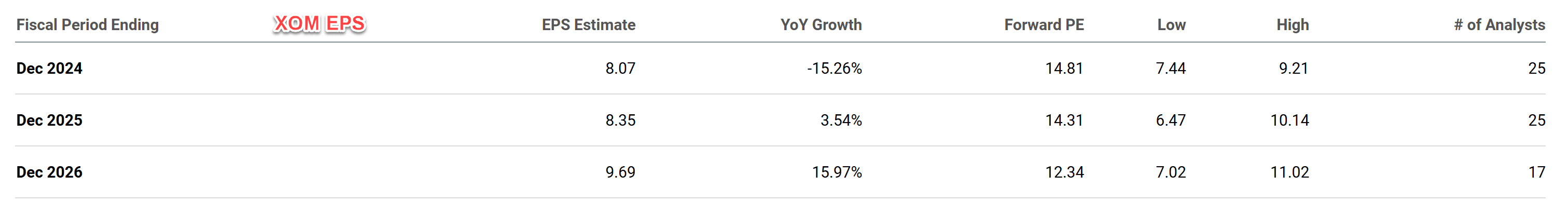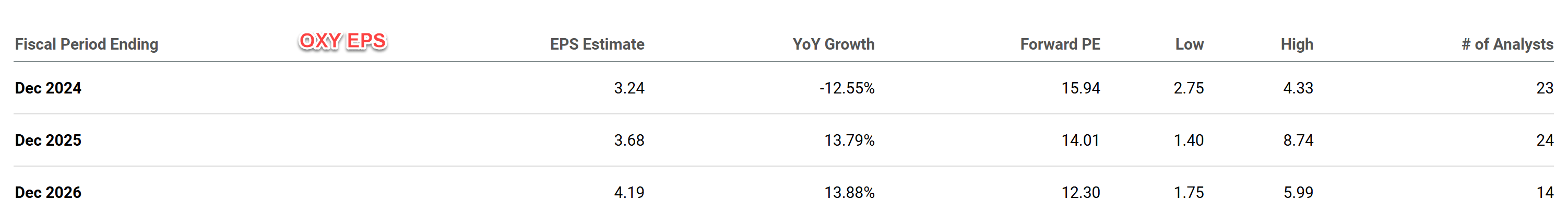 XOM is not only more profitable but also cheaper. As you can see from the chart below, the forward P/E ratio based on its FY 2024 EPS is estimated to be 14.81. As its EPS is projected to recover in FY 2024 and grow in the next few years, the P/E ratio is expected to further decline. For instance, the forward P/E ratio for FY 2025 is estimated to be 14.31 and 12.34 for FY 2026. In comparison, the forward P/E ratio for OXY is about 15.94 based on its FY 2024 EPS projection, noticeably above XOM’s 14.81. Looking further out, OXY’s P/E ratio is expected to decline as well, thanks to its EPS growth to be similar to XOM’s in FY 2025 and 2026.