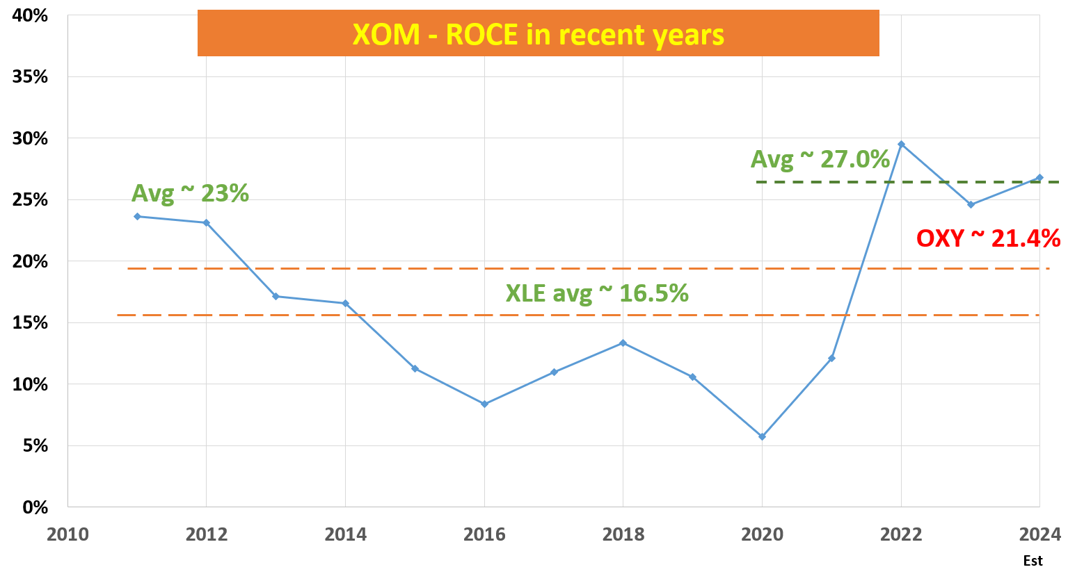 Under these considerations, XOM’s ROCE is on average 27% in the recent 3 years, vs. OXY’s 21.4%. Also, note that both XOM and OXY’s average ROCE is better than the sector average of 16.5% as approximated by XLE’s return on equity.