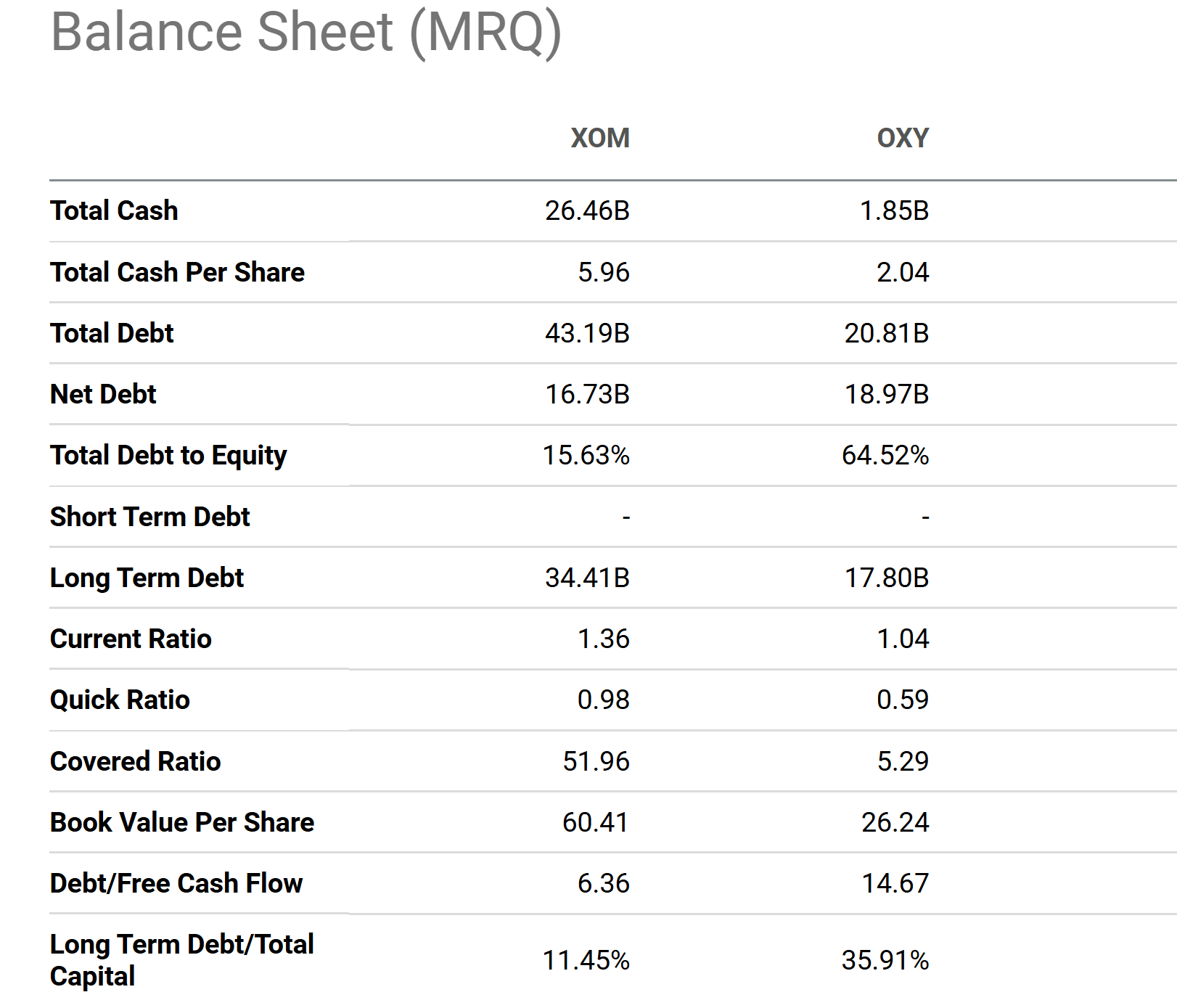However, I see XOM as better positioned for growth than OXY going forward for at least two reasons. The first one was XOM’s better ROIC and better ROCE as discussed earlier. With a higher ROIC or ROCE, each dollar invested in growth CAPEX tends to lead to higher EPS increases. Second, XOM is also in a better financial position to invest more sustainably and aggressively toward growth than OXY. As you can see from the following chart comparing XOM and OXY stock’s balance sheet data, XOM possesses a significantly larger cash position, holding $26.46 billion compared to OXY’s $1.85 billion.