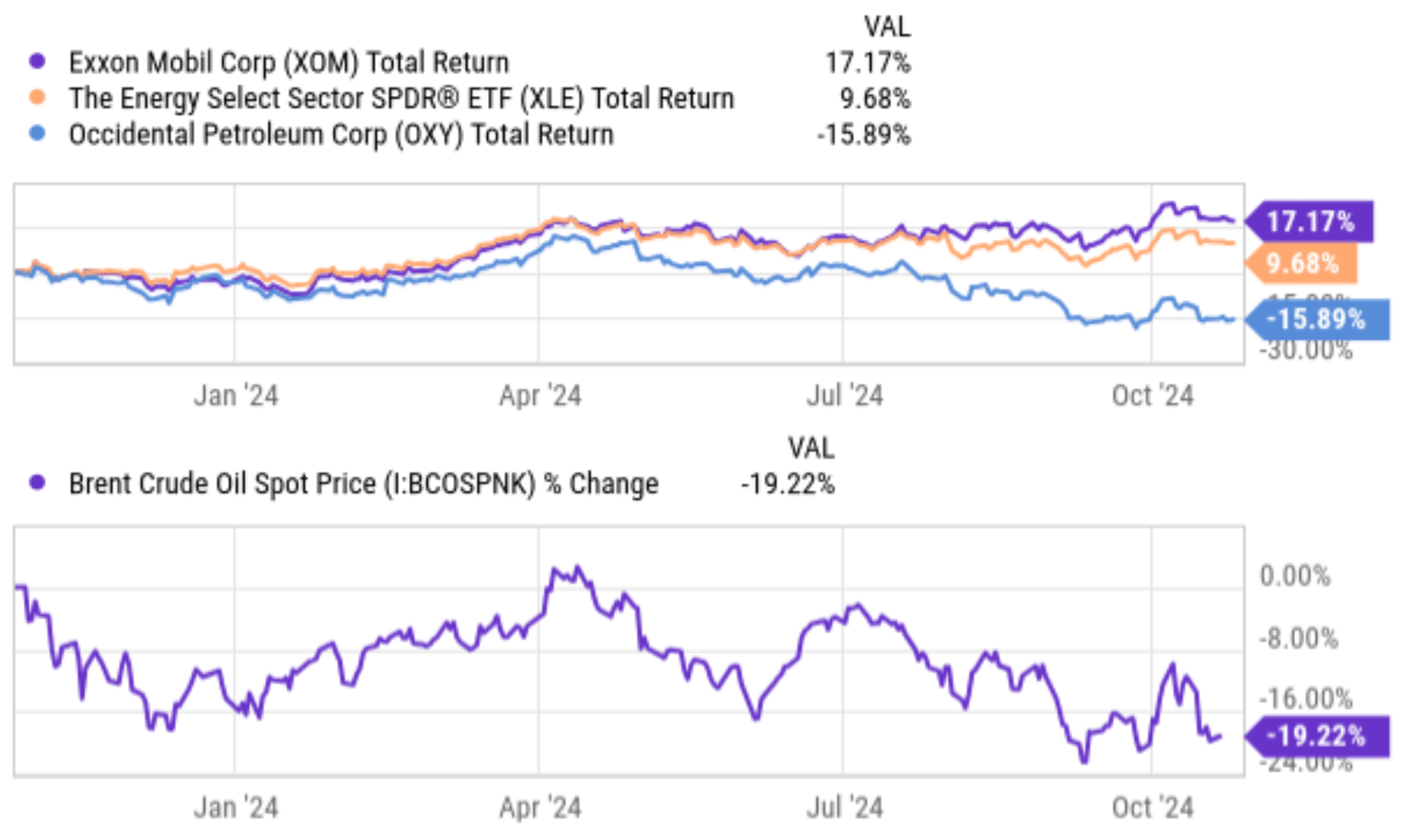 To start, let’s look at the common factor that has impacted both stocks and also the energy sector lately: the change in oil prices. As you can see from the chart below, oil prices, as represented by the Brent Crude Oil Spot Price (BCOSPNK), have been under pressure lately. To wit, Brent Spot Price has declined almost by 20% in the past 12 months, currently hovering around $68 only as of this writing. The decline in oil prices has translated into large profit headwinds and also stock price pressures for both XOM, OXY, and the sector as a whole, although the pressures were distributed unevenly. As an example, XLE lagged the overall market drastically but managed to gain moderately with a total return of 9.6%. In contrast, OXY has suffered a total loss of more than 15% and XOM has enjoyed a robust gain of over 17%.