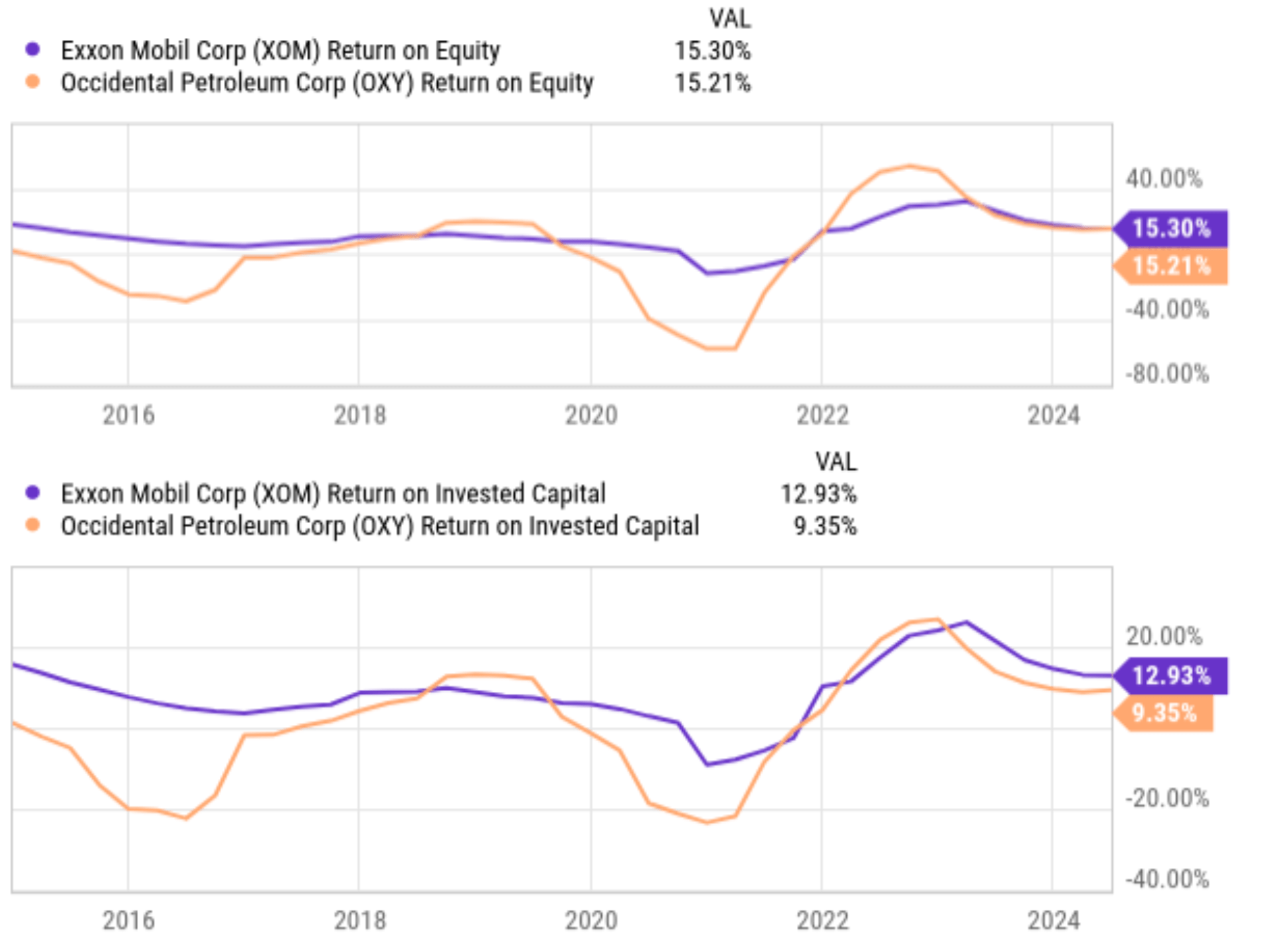 Many investors like to use profitability metrics like margins, Return on Equity (ROE), Return on Asset (ROA), etc. These metrics have their merits and suggest that XOM and OXY have similar levels of profitability. As an example, the chart below shows that XOM’s current ROE is around 15.30%, on par with OXY’s ROE of 15.21%. However, these metrics can be misleading for reasons detailed in our earlier writings. For example, equity could include idle cash and thus underestimate the ROE, which is of particular relevance for this article as we will see a bit later.
