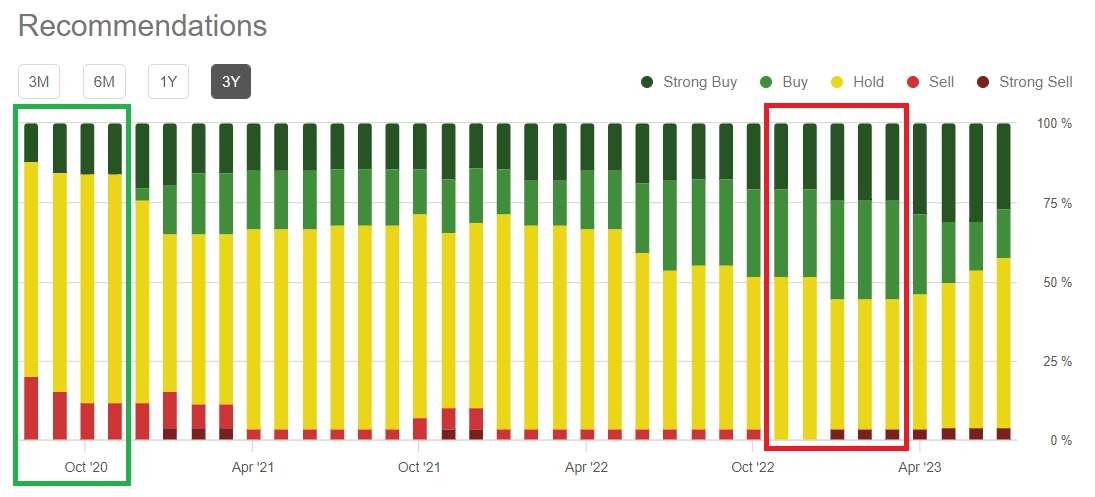 To illustrate how the popular opinion on the stock has changed over the years, we could take a look at the distribution of sell-side analysts’ ratings over time. On the very far left (marked in green) is what Wall Street thought of XOM at the time when I turned bullish – mostly hold ratings with very few buys.