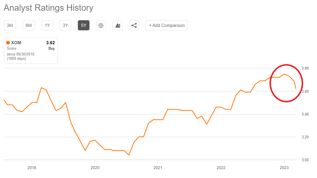 The consensus view has changed dramatically since then and reached the other end of the spectrum at the end of 2022 and the beginning of 2023 – just when Exxon’s share price peaked (see the graph above).