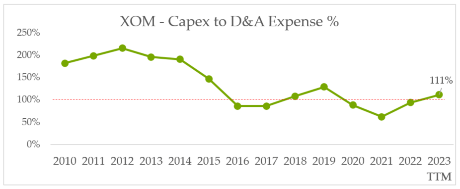 That is why, XOM is now dialling up its Capital Expenditures and the ratio of Capex to Depreciation & Amortization expense has just passed the 100% mark, which indicates expansion.