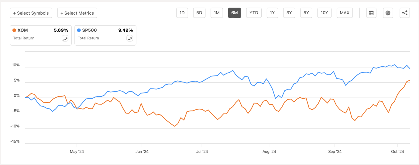 Considering all of this, in the foreseeable future, the price action of Exxon Mobil’s stock will be dictated primarily by the developments that are happening in the Middle East. This has its own upsides and downsides. While Exxon Mobil’s stock was mostly underperforming against the broader market since late 2023 when I published my latest article on the company, recently things started to change. The chart below shows that in the last six months, the total returns for Exxon Mobil’s stock were below the total returns of the broader market.