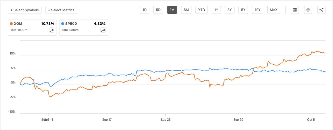 However, on a 1-month chart, we see that the company’s stock has outperformed the broader market, primarily thanks to the increased volatility in the oil market caused by the rising tensions in the Middle East. It’s safe to assume that in the following weeks, Exxon Mobil’s stock will likely outperform the S&P 500 as well since the market is waiting for the Israeli retaliation that can result in greater volatility in the oil market and a further appreciation of the company’s shares.