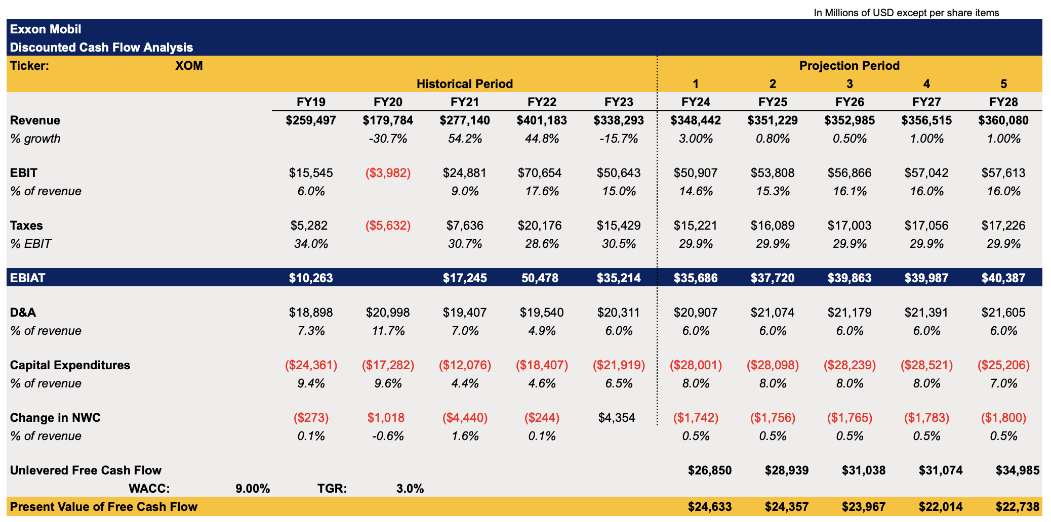 The updated model below assumes that revenues in FY24 and beyond will increase Y/Y primarily thanks to the higher-than-expected average oil prices for the year that were caused by rising tensions in the Middle East. The EBIT as a percentage of revenue is expected to stay at double-digits, as the company will be able to keep its margins relatively high thanks to receiving lucrative assets in the Permian Basin that Exxon Mobil got after acquiring Pioneer Natural Resources. The CapEx in the model closely correlates with the management’s guidance and includes the spending related to Pioneer Natural Resources assets. The WACC and the terminal growth rate in this model are the same as before.