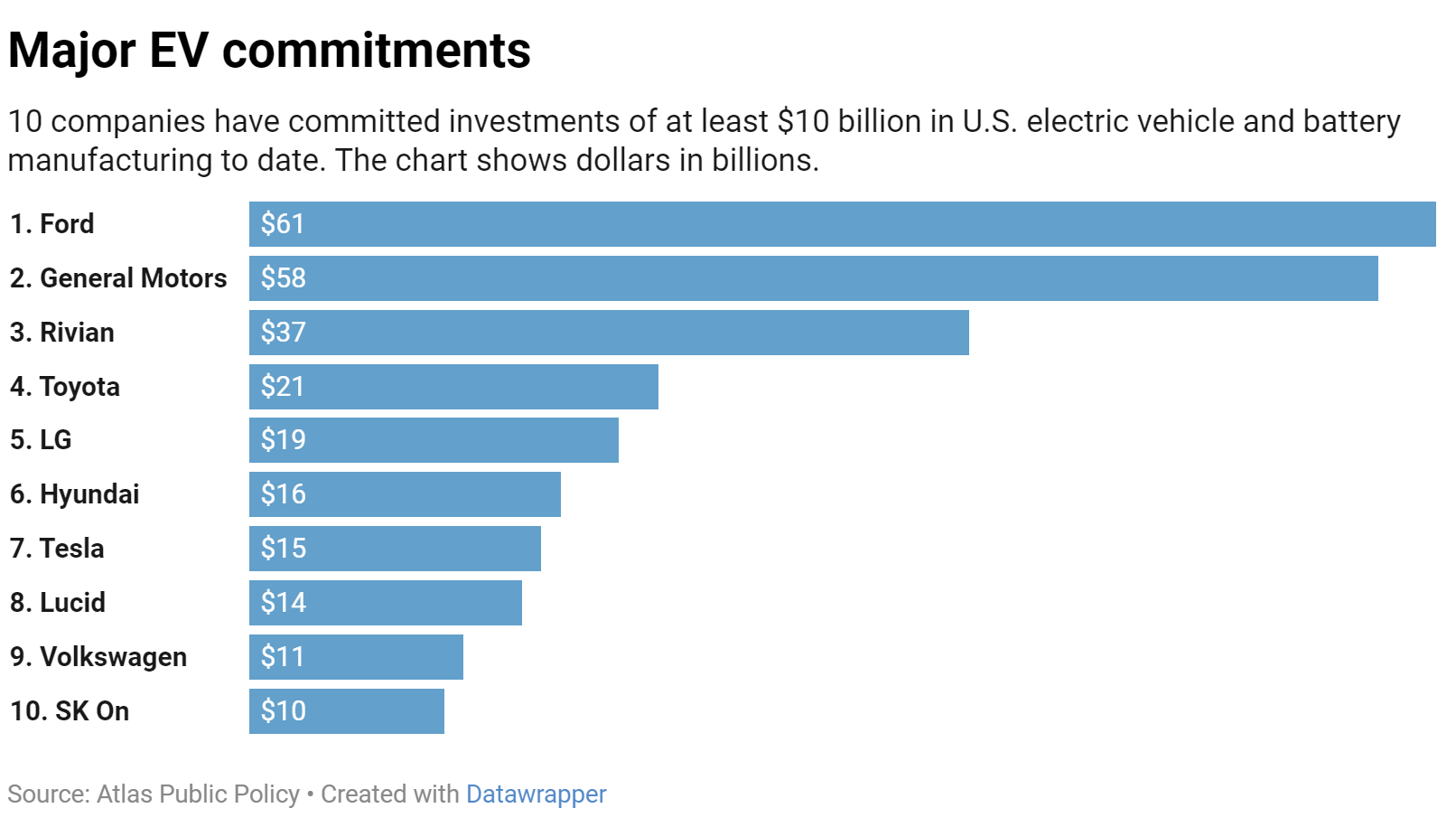 According to Atlas Public Policy, which tracks alternative fuel investments, Ford previously allocated $61 billion toward BEV projects, placing it first among major automakers in terms of amount. How much of that amount actually will be spent, or is recoverable by changing strategy, is unclear.