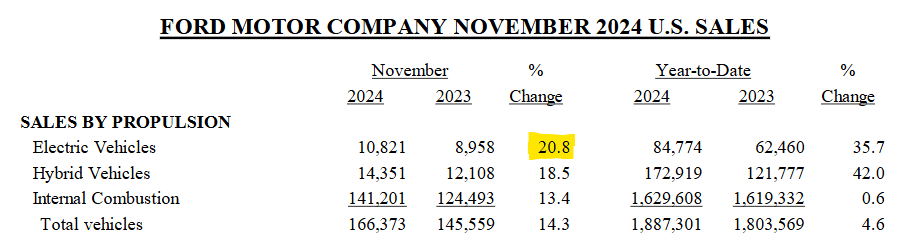 Ford Motor sold 166,373 vehicles in the month of November, up 14.3% YoY. Of those, 10,821 were electric-vehicles, or 6.5% of all sales. In the year ago period, only 6.1% of total sales were electric-vehicles, so while Ford Motor has slowed down its production lines for its EVs in 2024, deliveries are actually on a good run-rate. Ford Motor’s total electric-vehicles sales grew 20.8% in November and thereby 45% faster than total vehicle sales in November.