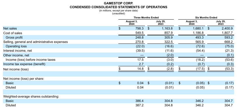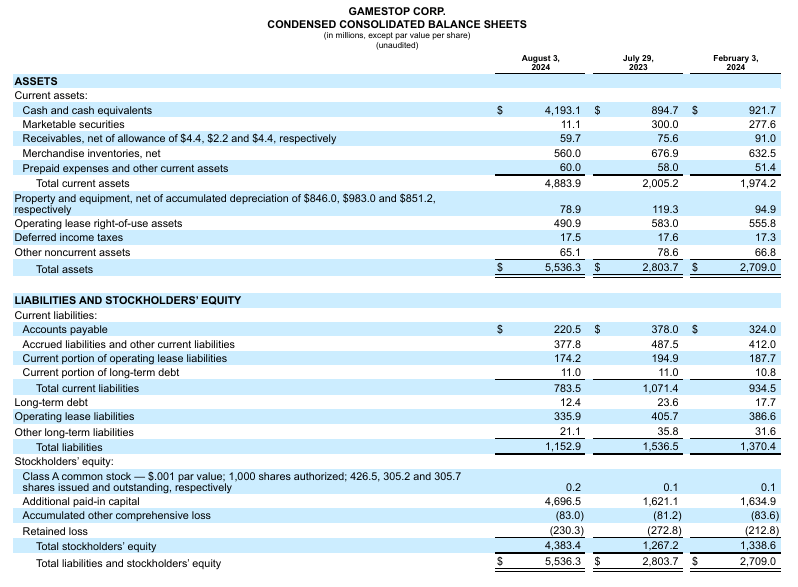Senior leadership has done an incredible job utilizing the public markets to raise capital while the underlying business was eroding. GME’s sales in Q2 declined -31.4% from $1.16 billion to $798.3 million YoY. The only reason GME made a profit in Q2 was that it generated $39.5 million in interest and investment income. GME’s revenue reached multi-year lows across the board as hardware sales declined -24.56% from $579 million to $451 million. GME’s software sales followed hardware lower as they declined -47.61% YoY from $397 million to $208 million, and collectibles fell -18.24% from 170 million to 139 million. Without the strength of GME’s balance sheet, the overall business would continue to burn cash rather than make a profit in the past 2 quarters. The balance sheet is ultimately its greatest asset as it is able to help generate enough income from invested capital to pad the operating losses and provides GME with the flexibility to reinvest itself.