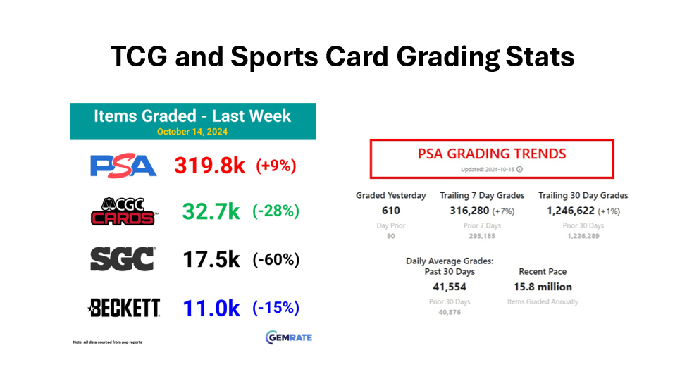 Recently, Nat Turner, the CEO of Collectors, showed off his $30 million card collection. Collectors owns PSA and recently acquired SGC, which is the 3rd largest grading company. Outside of actually collecting or investing in sports and TCG cards, there is a whole grading industry. GemRate aggregates all of the data through population reports from the grading companies to provide grading trends to the community. To put things in perspective, PSA graded 319,800 items last week and is on track to grade 15.8 million items on an annual basis. The daily average of graded items from PSA is 41,554 over the past 30 days. The base rate for PSA to grade a card worth under $500 is $24.99 if you’re not part of their collectors club. There are significant upcharges depending on the value of the item being graded if the value exceeds $500. Just on that math alone, if every card costs $24.99 to grade, PSA would be on track to generate $394.84 million in grading fees alone. The number is probably significantly higher due to upcharges, but this is just 1 segment of the actual business.