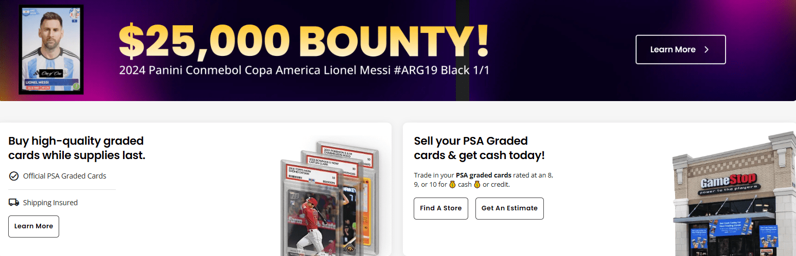 GME announced today that it has become an authorized PSA dealer. GME will now be in the card grading business by providing authentication and grading services for trading cards. This comes after GME started purchasing Pokémon cards that have been graded by PSA and received a grade of 8 or higher. GME has expanded its services, and through their website, you can purchase and sell sports and TCG-graded cards. GME is even getting in on public bounties for rare cards and is offering $25,000 for a 2024 Panini Lionel Messi 1/1 while advertising their trading card business by adding banners outside of locations. The idea through the partnership with PSA is that individuals can drop off their cards to be graded, and GME will take care of the submission from paperwork to shipping. Customers will have visibility into the process where they are authenticated, graded, and encapsulated, and then they will receive a notification when they are ready to be picked up. By getting the customer back into the store, GME can either keep their graded cards, sell them to GME, or trade them for other graded cards.