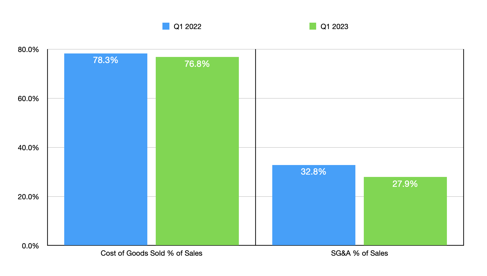 Other profitability metrics for the company also improved year-over-year. Operating cash flow, for instance, went from negative $303.9 million to negative $102.7 million. If we adjust for changes in working capital, it would have gone from negative $107.3 million to negative $28.1 million. And finally, EBITDA for the company went from negative $125.5 million to negative $29.4 million. Despite the drop in the sales, the company did benefit from changing conditions. Its gross profit margin, for instance, expanded from 21.7% to 23.2%. This is largely thanks to a decrease in freight expenses that the company achieved by focusing on cost reduction activities. Selling, general, and administrative costs went from 32.8% of sales down to 27.9%. This can be chalked up to lower labor related and consulting service costs, as the company continued to focus on a leaner operating structure.
