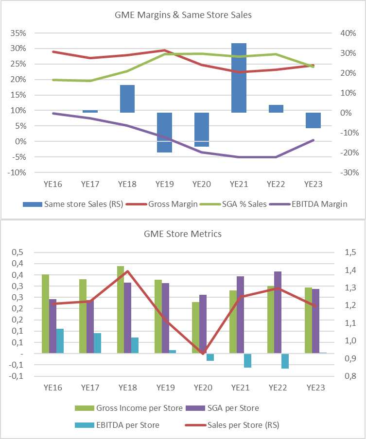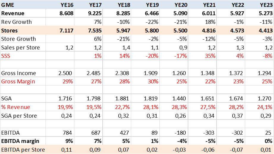 GME has cut 40% of its stores since 2016 and has seen same-store sales fall 1% while gross margin contracted to 25% from 29% and SGA per-store grew 19% that drove EBITDA to negative. It’s been a losing battle that seems difficult to revert.