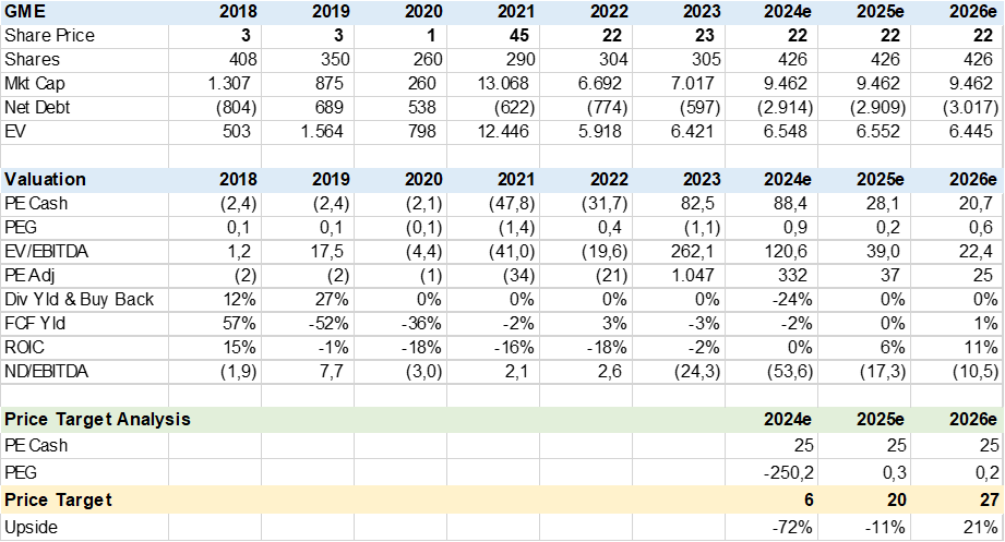 There are only a few analysts that cover the stock, while the company’s disclosure and market communication have diminished. Thus, I decided to present three possible scenarios for GME and potential valuation. The key drivers are same-store sales, store count, gross margin, SGA per-store, capex, and working capital needs. The recent follow-on, that injected US$2.3bn, provides the company with the ability to execute a turnaround or delay the inevitable.