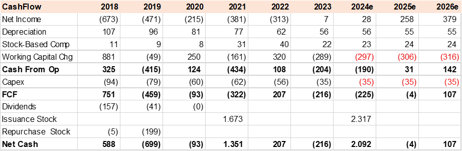Under the turnaround scenario, I assume the company can grow sales by 3% which translates into 9% same-store sales growth that helps reduce SGA per-store cost and boost EBITDA margin to 5% by YE26. This turnaround does fly in the face of the current consumer trends, but perhaps the cash infusion allows the company to increase marketing/promotions to draw back traffic.
