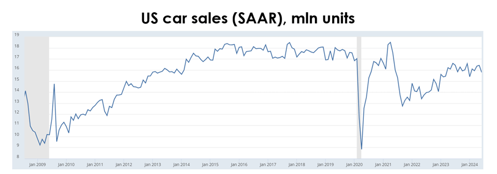 In 2Q 2024 US car sales continued to stagnate and averaged 16.2 mln units, compared with 16.3 mln units a year earlier (-0.7% y/y).