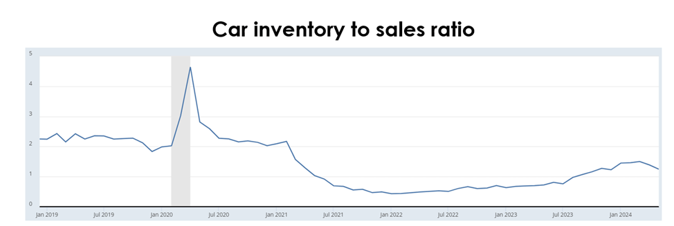 The inventory-to-sales ratio of cars was 1.25x at the end of May 2024 compared with 1.39x at the end of April, indicating that auto supply is exceeding demand, prompting a buildup of inventories at dealerships.