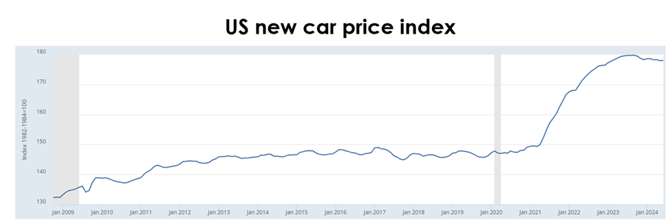As in the previous quarter, the US new car price index remains high amid a persistent imbalance between supply and demand, barely declining from the previous level.