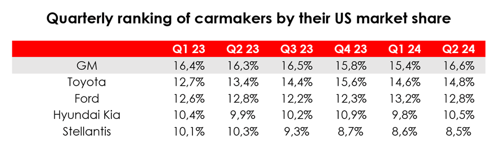 In the second quarter, the company consistently increased its market share in its largest market, the US, to 16.6% (+1.2 pp qoq), in contrast to its major competitors, whose share remained virtually unchanged overall. As a result, GM’s North American auto sales surpassed pre-COVID levels for the first time in four years. Car sales in the GMI segment also increased significantly during the quarter, despite the ongoing difficulties in China. In addition, the operating margin remains very high compared to historical data due to the continued optimization of production processes and the introduction of lower-cost models.