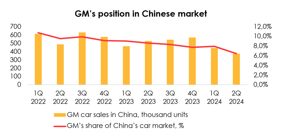 In its largest market in the GMI segment, the company continues to face the challenges we described in our previous report: price competition, rising consumer confidence in domestic brands and rising demand for electric vehicles, and a tightening regulatory environment with respect to emissions. GM’s market share in China declined to 6.4% (-1.5 pp q/q) in 2Q 2024.