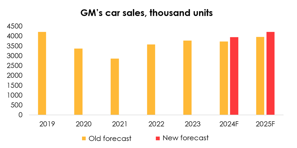 We are raising the forecast for GM’s car sales from 3.7 mln units (-0.9% y/y) to 3.95 mln units (+4.8% y/y) for 2024, and from 4 mln units (+6.1% y/y) to 4.2 mln units (+6.7% y/y) for 2025 following the improved outlook for car sales in and outside North America (for both gas-powered and electric vehicles).