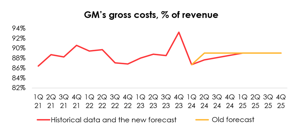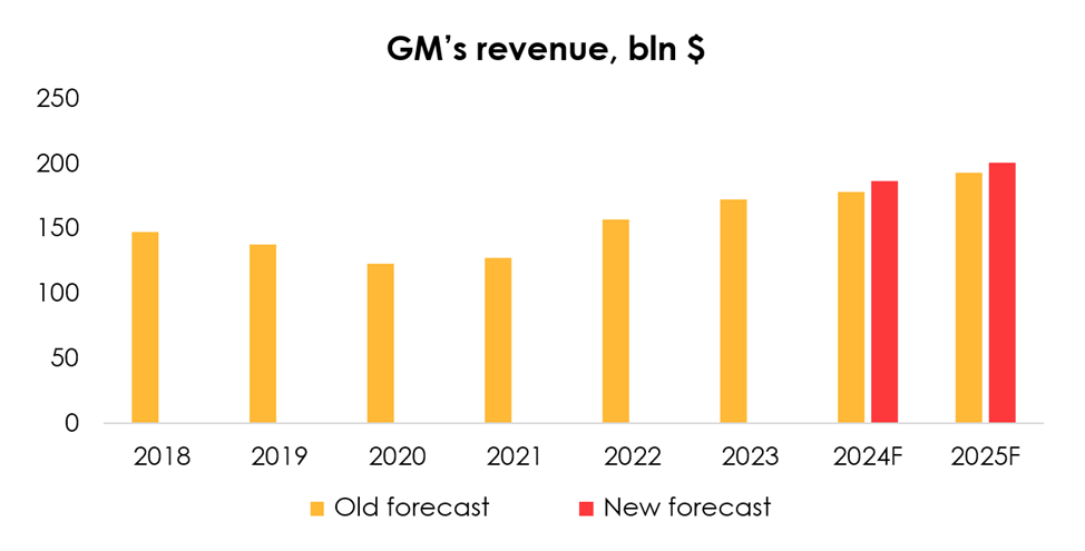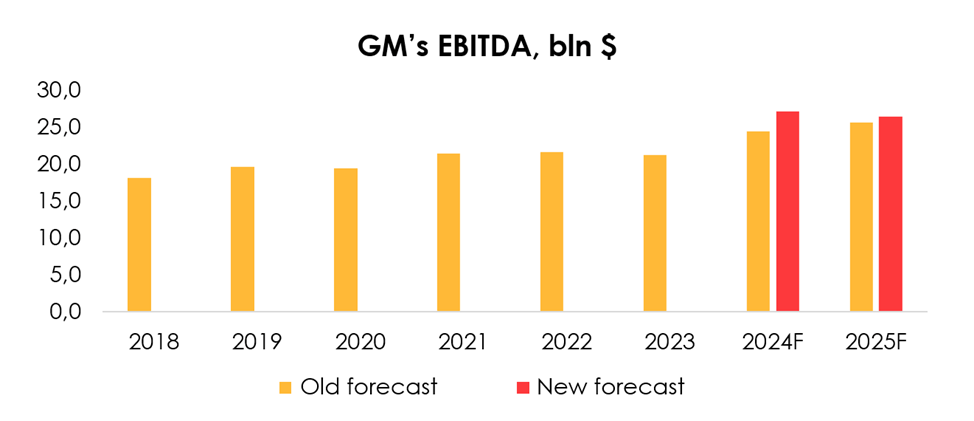 We are raising the EBITDA forecast from $24.4 bln (+15% y/y) to $27 bln (+27% y/y) for 2024, and from $25.6 bln (+5% y/y) to $26.4 bln (-2% y/y) for 2025 due to the increased forecast for GM’s revenue in 2024 and 2025.