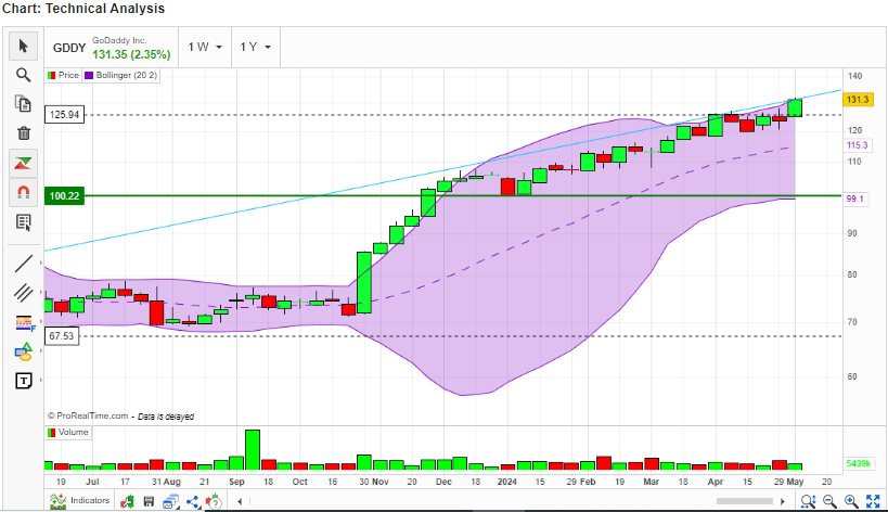 • GDDY stock has outperformed the S&P 500 by 62.51% in the past year and is currently on a strong bullish trajectory.