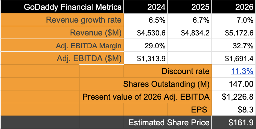 Based on the sales & booking momentum the company has demonstrated in the last few quarters, GoDaddy should be able to easily achieve this target. In fact, I believe the company still has room to penetrate their own network of 21 million customers with their A&C products. This could easily scale the 7% CAGR mark, but, being conservative, I’ve estimated a CAGR of 6.7% through FY26.