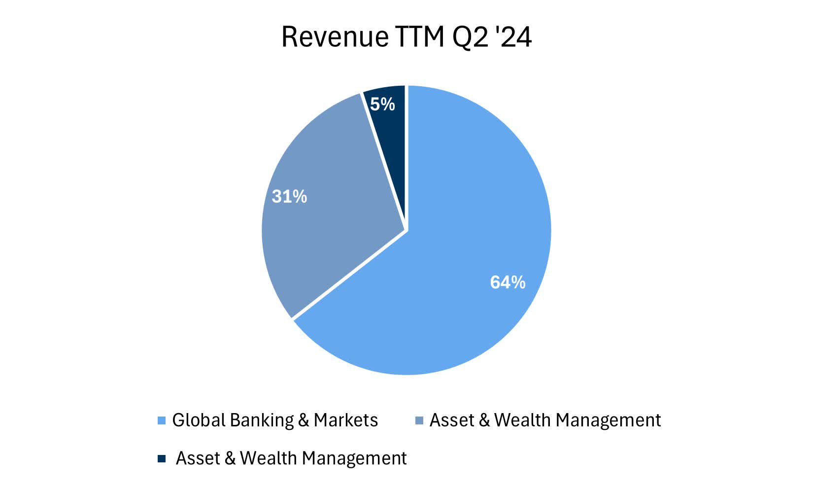 The core business comes from the Global Banking & Markets segment, which together provide classical services such as investment advisory, underwriting, research, and market-making activities in FICC and Equities. Not long ago, these were two independent segments but were consolidated into one following a business reorganization plan. Although most of the revenues come from this segment, it has the particularity of holding the highest amount of cash flow uncertainty, since revenues here are highly dependent on market activity.