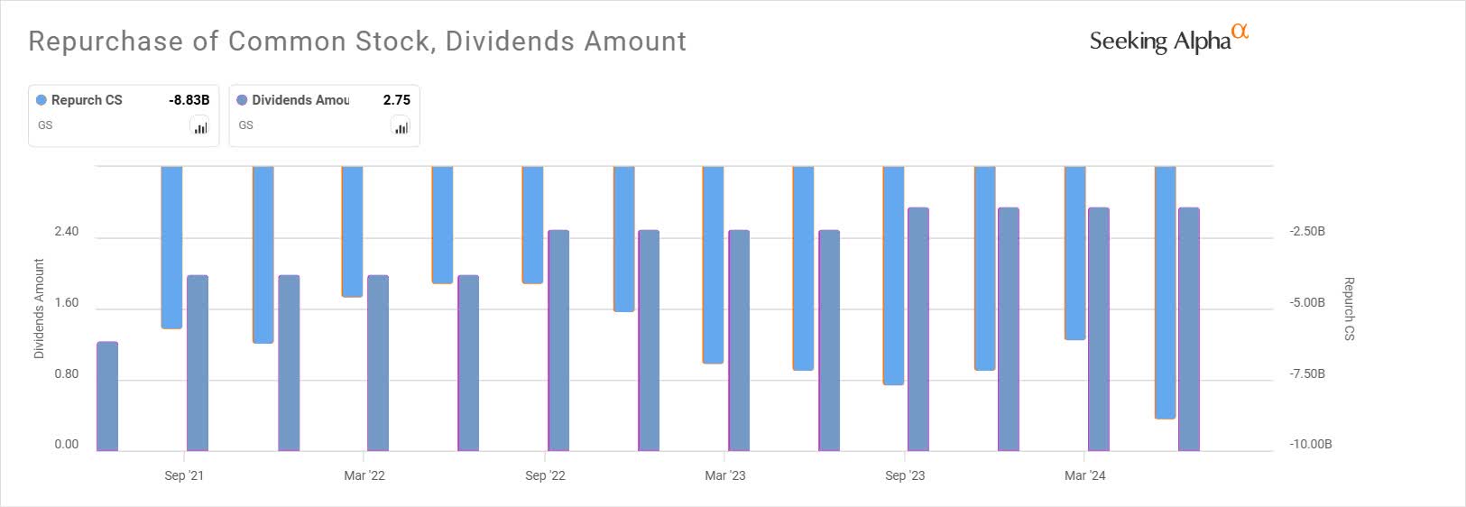 Now, when adding the dividends paid and shares repurchased in H1, with two dividend payments of $3, multiplied by the latest total common shares outstanding, implies a shareholder yield of approximately 5.2%. Yet, shareholder yield within the G-SIBs should be taken with a grain of salt as their heavy regulatory surveillance may restrict them from ongoing share buybacks or even their dividend payments, so these distributions are in part Basel III dependent. Nonetheless, GS currently has a CET1 ratio of 13.0%, which is comfortably above the minimum requirement for global systemic banks.