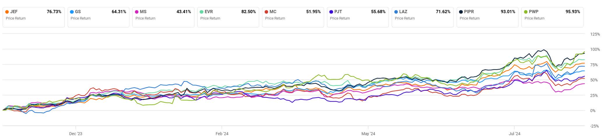 Although a multiple expansion that trades far above its history might trigger a sell sign, due to tailwinds from rate cuts, and a modest recovery in M&A activity with the potential to rebound back again to historical levels, I will rate the stock of Goldman Sachs as a hold. Also, it could be (or not) the case that rising earnings alone in Q3 could easily make the multiple normalize without the stock necessarily dropping. But what is true, is that the 64% rise since November, is mainly an industry phenomenon, as other investment banks have also gained similar returns within those levels. Therefore, a hold makes more sense to me.