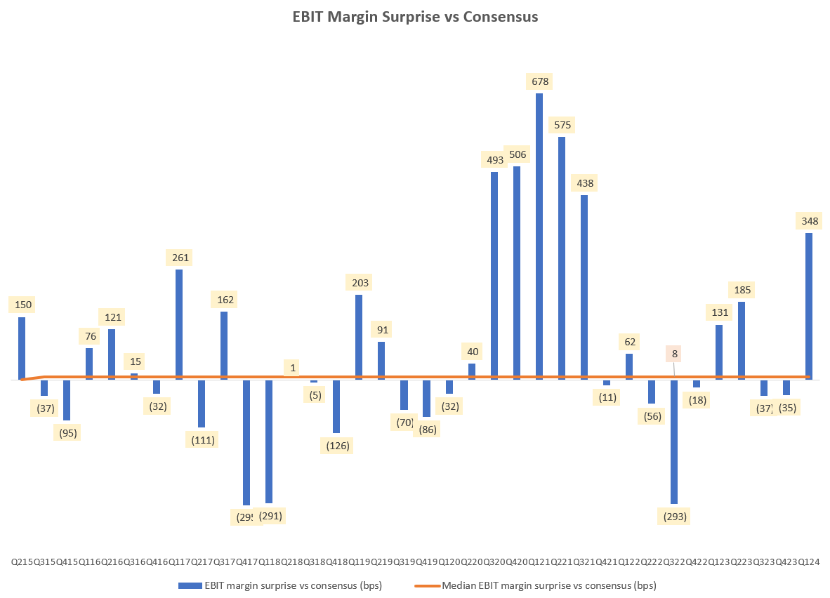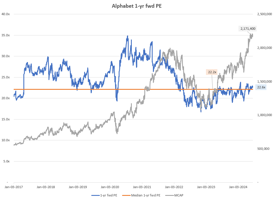 • I recognize upside risks if Other Bets’ EBIT margins breakeven, as this may sidestep FCF margin erosion. Also, the stock’s upside has so far been driven mostly by earnings growth. Multiple expansion in the stock is an upside risk.