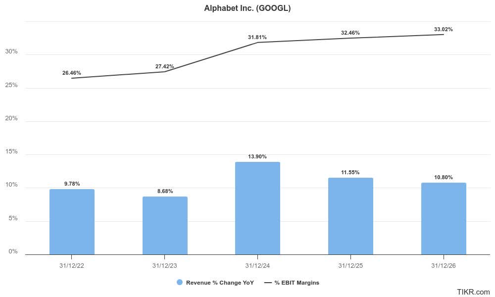Consequently, it has improved the market’s assessment of Google’s execution (“A-” revisions grade), underpinned by its robust profitability. As seen above, Google’s adjusted EBIT margins are expected to continue scaling higher as Wall Street lifts its forecasts on Google’s revenue growth prospects over the next two years.
