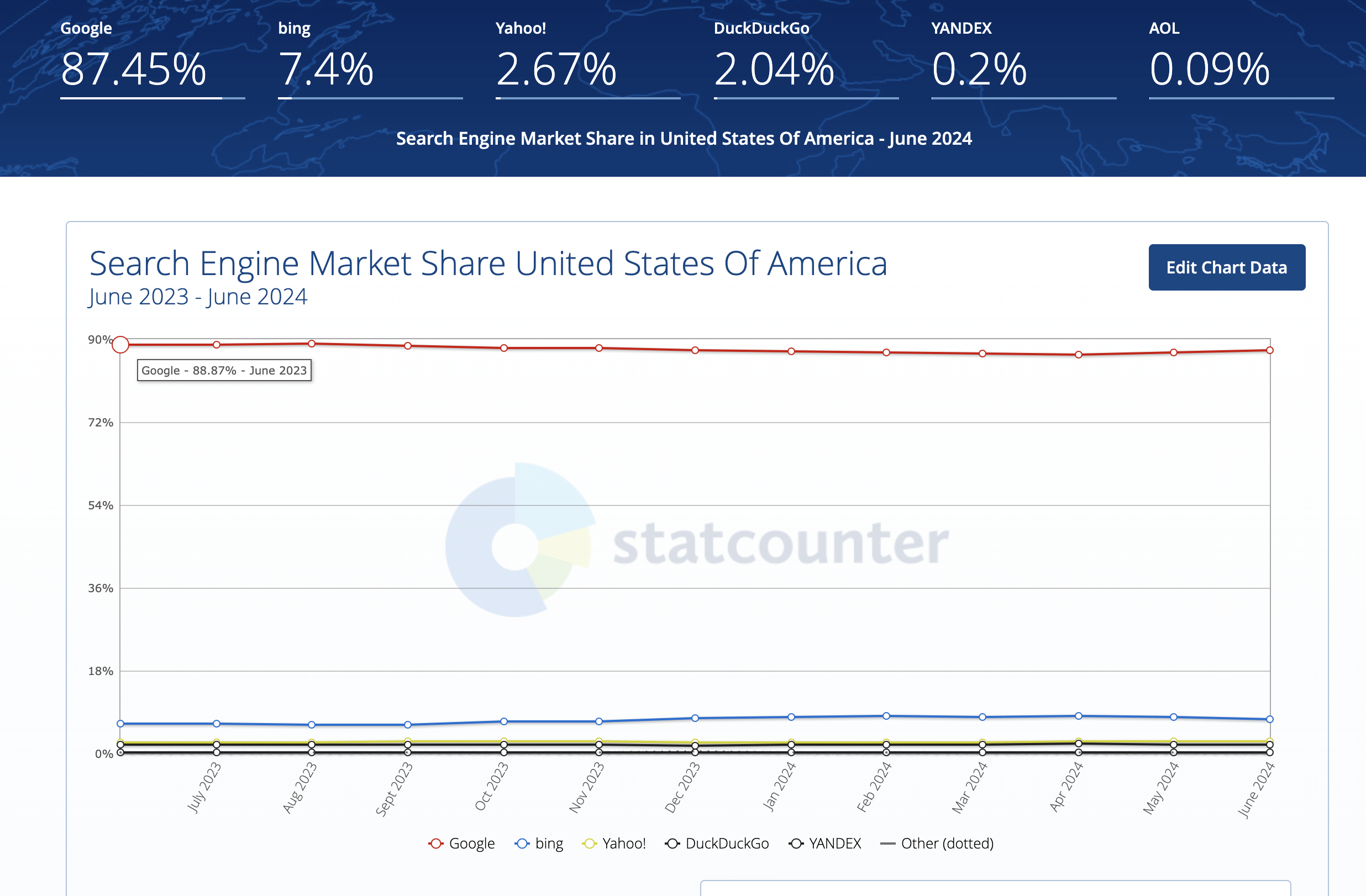 In the key U.S. search market share, Google is still at 87.5%, though down from 88.9% last year. Global market share remains 91.1% for total dominance by Google, with Microsoft (MSFT) Bing only grabbing a 3.7% share.