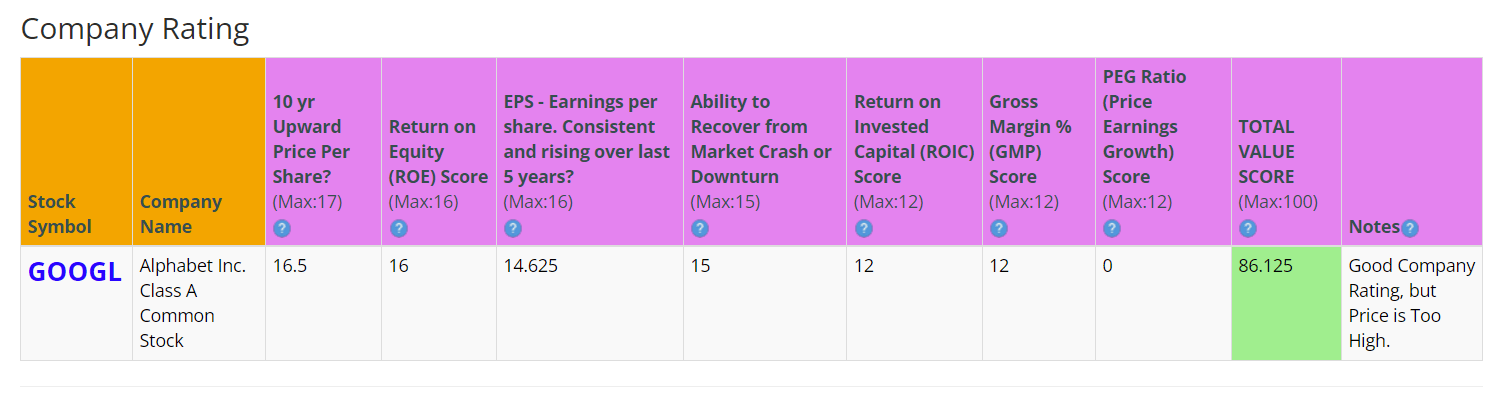 A fast way for me to get an overall understanding of the condition of the business is to use the BTMA Stock Analyzer’s company rating score. Alphabet shows a rating score of 86.125 out of 100. This is a very good score, showcasing strong fundamentals.