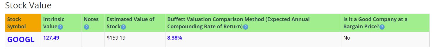 The Estimated Value of the Stock is $159.19, versus the current stock price of $168.40. This indicates that Alphabet is slightly overpriced.