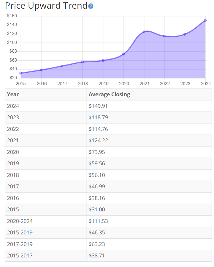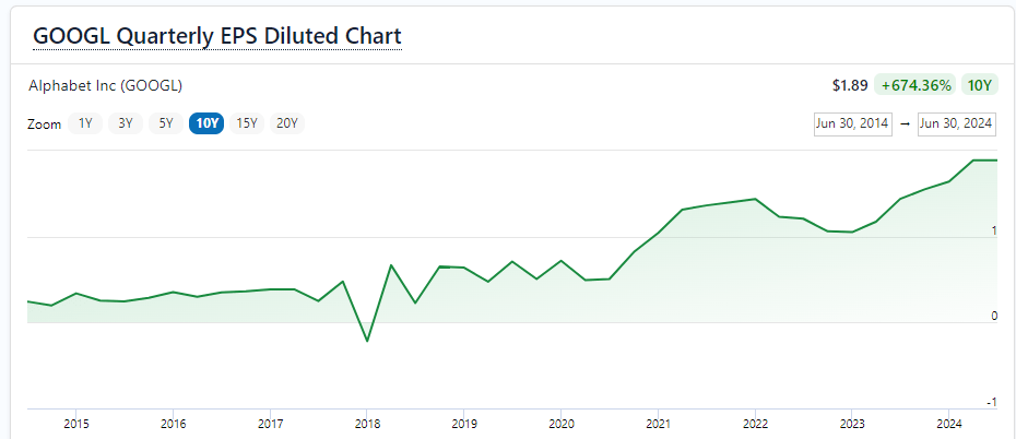 Google’s share price has grown significantly and consistently over the last 10 years. Strong revenue growth and expansion of its cloud business drive further increased valuations of the stock. The potential of the AI industry boom is also a source of potential growth for Alphabet over the long term, leaving room for further increases in the stock price. Overall, the share price average has grown by about 383.58% over the past 10 years, or a Compound Annual Growth Rate of 19.13%. This is a phenomenal return.