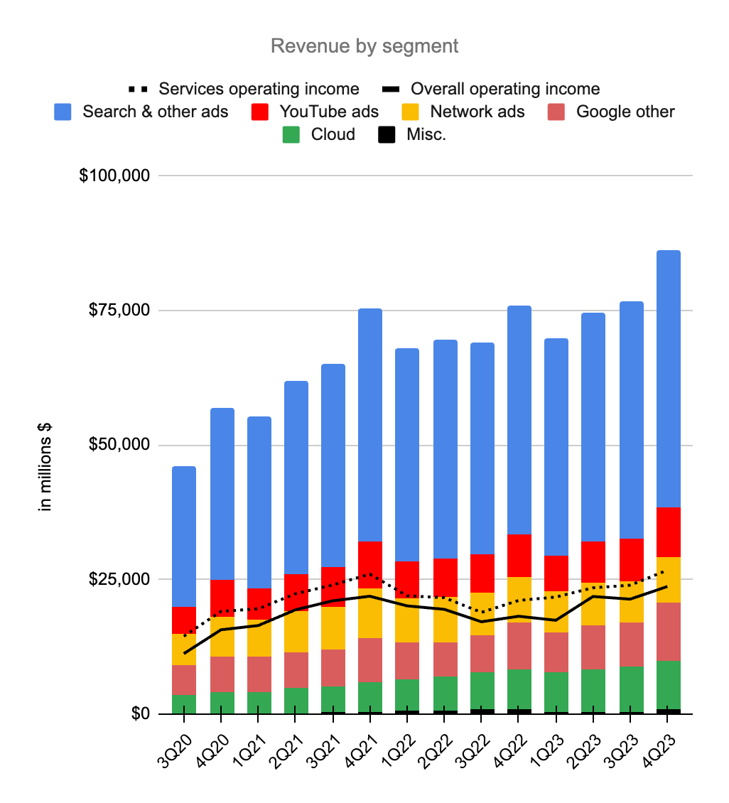 Per the 4Q23 release, segment revenue for Google continues to increase nicely over time: