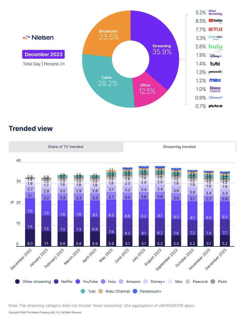 YouTube ad revenue increased 46% from $4,717 million in 4Q19 to $6,886 million in 4Q20. Since that time, revenue for the segment climbed to $9,200 million for 4Q23 which is a 3-year CAGR of more than 10%. Per Nielsen December Streaming Viewing report, the big streaming winners in the US are YouTube and Netflix (NFLX). They have 8.5% and 7.7% of TV viewing, respectively, which is a big part of the streaming total of 36%. YouTube is especially impressive as today’s 8.5% is much higher than their 7.5% from December 2022: