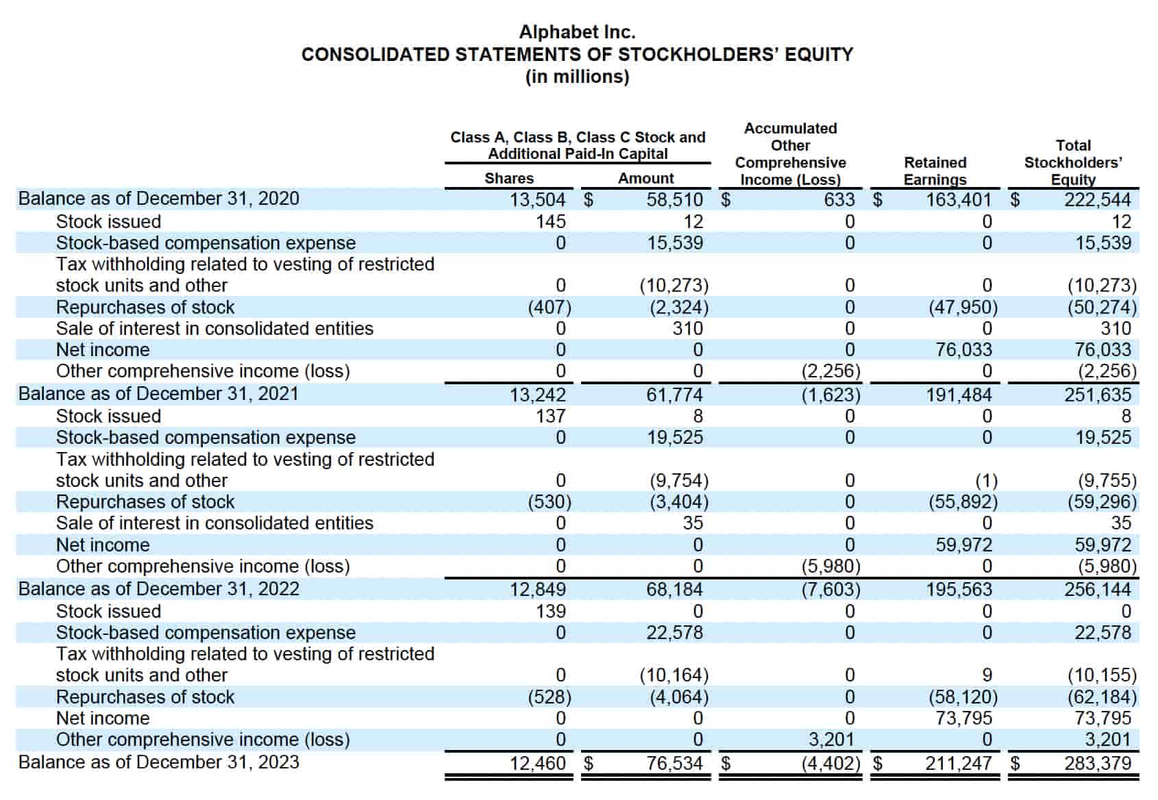 An important aspect of any company’s valuation is the way in which management allocates capital. Google’s management has used a significant amount of capital to buy back shares the last two years, and this has noticeably reduced the number of shares outstanding. The cash flow statement shows buybacks of $59,296 million in 2022 and $61,504 million in 2023. Looking at 10-K filings, there were 660,971,321 shares outstanding as of January 25, 2022. This was before the July 2022 20-for-one stock split, so the equivalent was 13,219 million shares outstanding. Due to buybacks which were partially offset by stock-based compensation (“SBC”), this fell to 12,807 million as of January 26, 2023 and 12,433 million as of January 23, 2024. In other words, the share count went down by 6% from January 2022 to January 2024 because of buybacks. The decrease in shares is even more impressive when we look at the December totals from 2020 to 2023 in the statement of equity. There were 13,504 million shares in December 2020 and this fell 7.7% to 12,460 million by December 2023 per the 2023 10-K:
