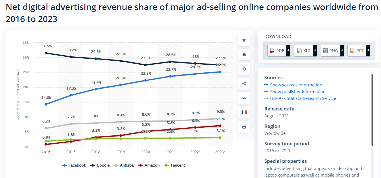 Google’s market share in digital advertising is 28%. Yes, that’s been falling over time, but not because Google’s ad revenue is falling, but because the industry is growing rapidly.