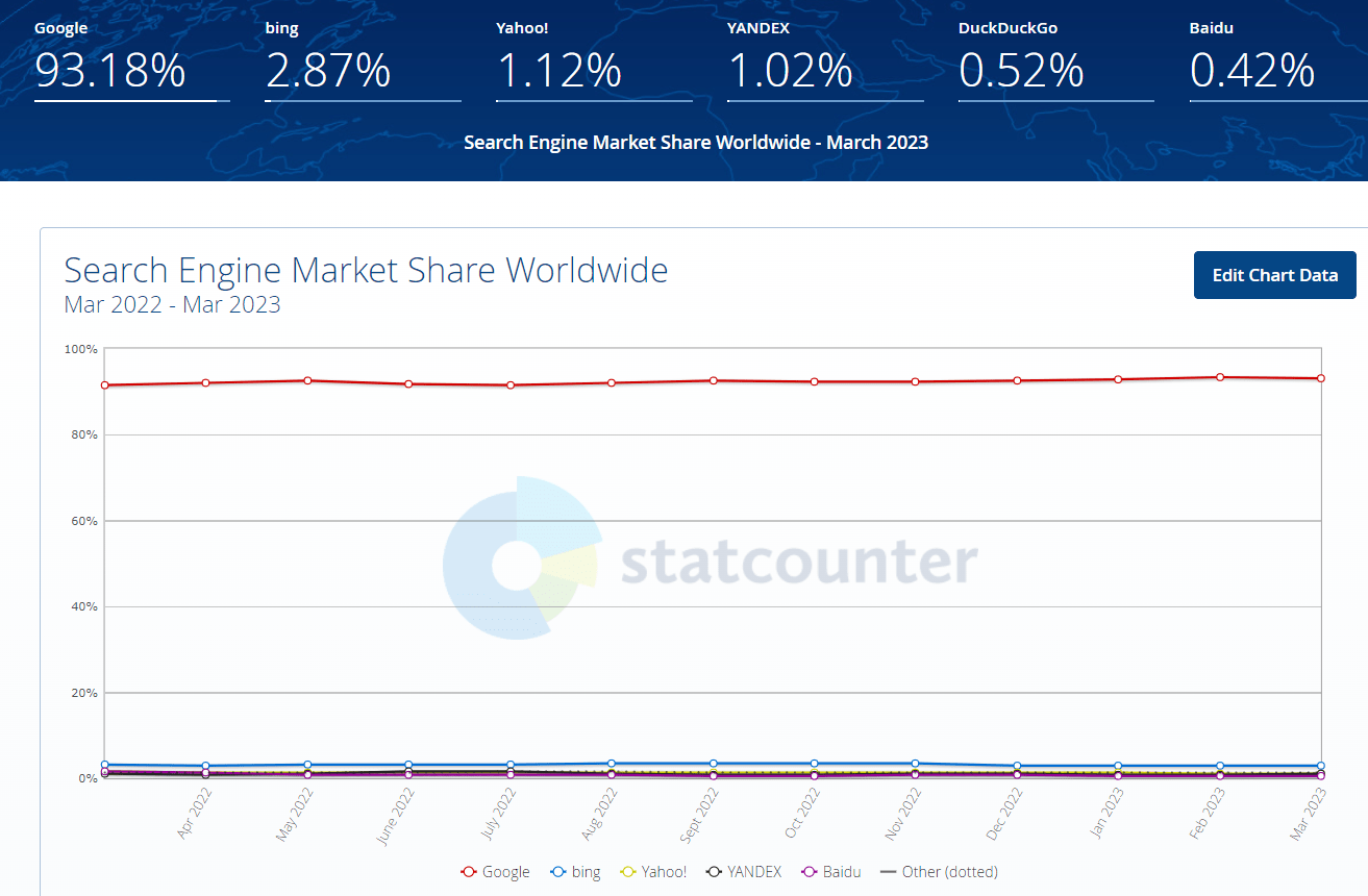 In March 2022, long before ChatGPT’s public launch, Google’s global market share in search was a Standard Oil/ASML-like 91.56%.