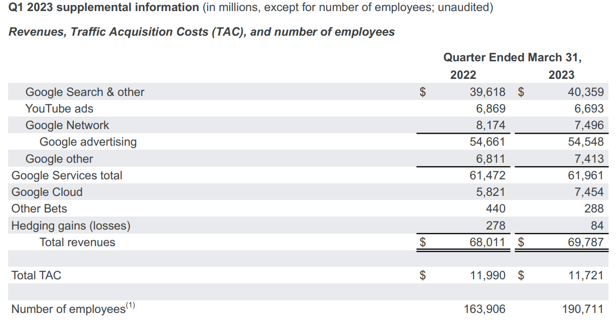 Search revenue grew 2%, with modest declines in YouTube ad revenue. Overall, ad sales were flat.
